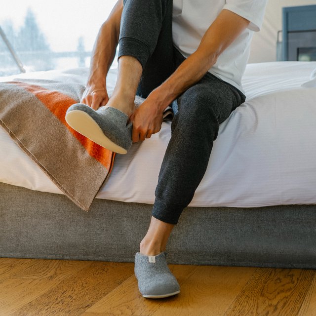 Qualität: Entworfen in der Schweiz. Handgefertigt in Nepal von lokalen Kunsthandwerkern. Erfahren Sie mehr über die Herstellung unserer Hausschuhe