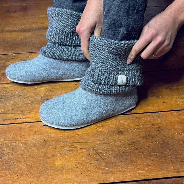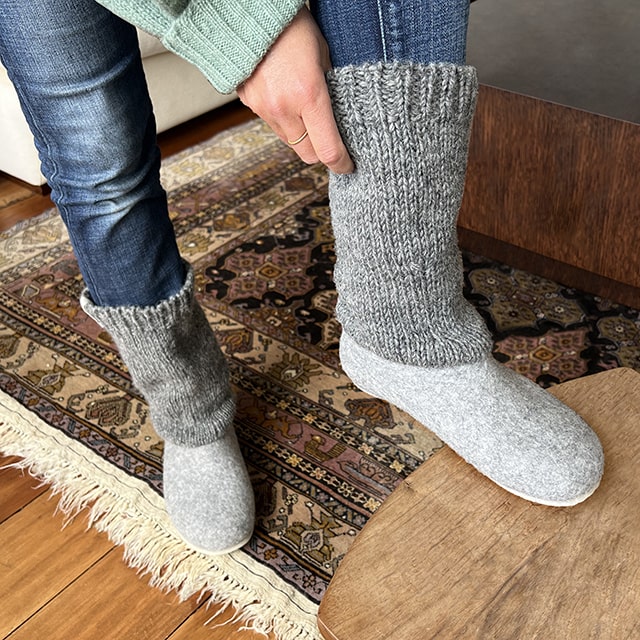 Materialien: Obermaterial aus natürlicher Wolle von neuseeländischen Schafen. Mulesing-frei. Sohlen aus Naturkautschuk. Das Obermaterial ist aus handgestrickter Schafwolle.