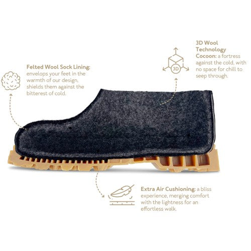 Materials: The bottom is a single-piece construction, hand-felted with 100% sheep wool. The upper is crafted with natural sheep wool and features a soft wool inner lining. Genuine top-grain Nubuck is added for extra support. The soles are made of durable rubber with good grip. Includes flat wool insoles for added comfort.
