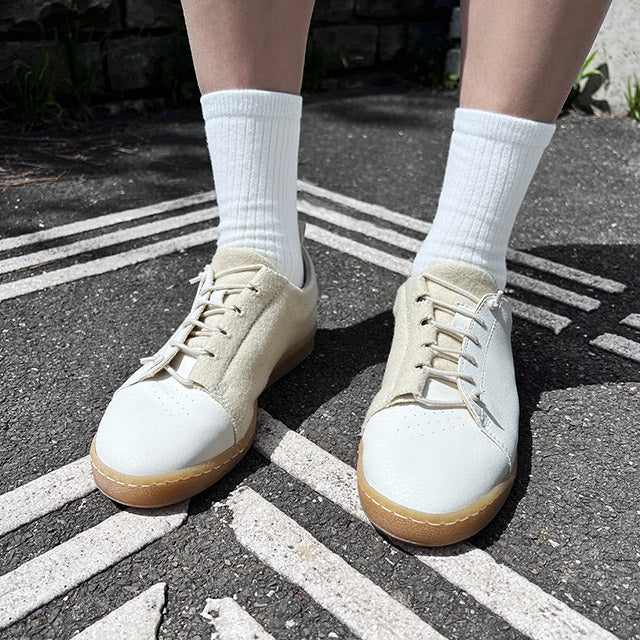 - Upper: 100% Burel Wool from Swiss Blacknose (white version) or Portuguese Sheep (black version) ethically sourced + MIRUM® a plant-based leather-like material containing no synthetics or plastic components
